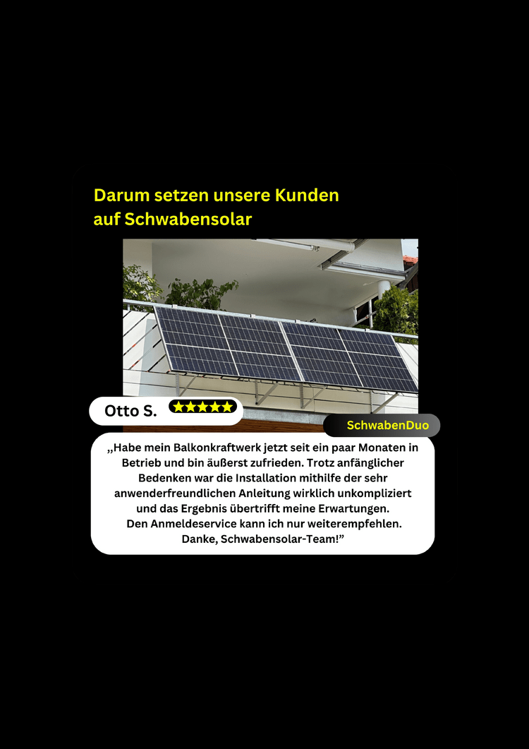 Wussten Sie, dass bisher ca. 98% aller in Betrieb genommenen Balkonkraftwerke von den Käufern selbst installiert wurden? Deshalb sind unsere Schwabenkraftwerke so konzipiert, dass Sie diese unkompliziert und schnell selbst installieren und problemlos selbst in Betrieb nehmen können.